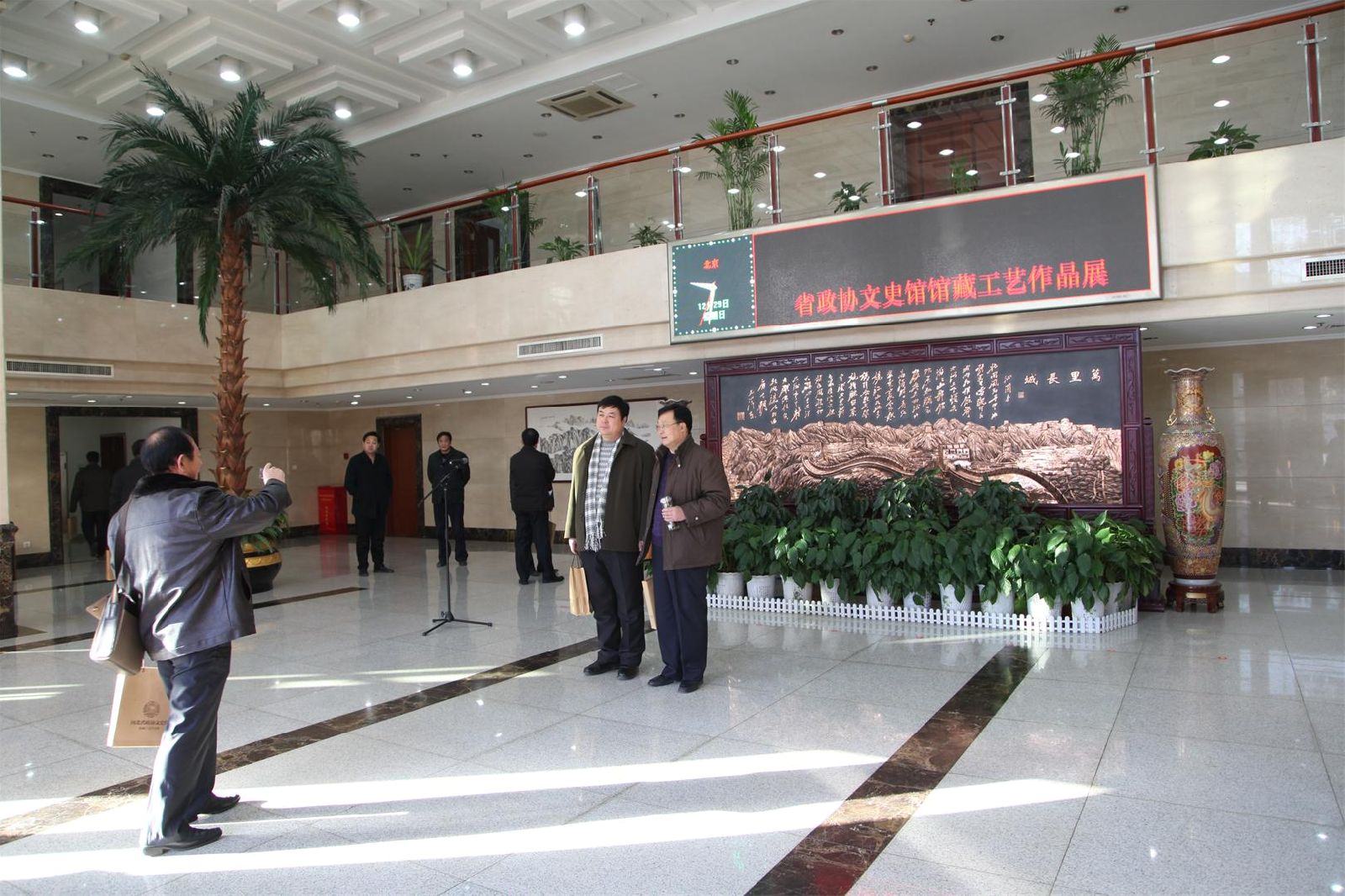 河北省文史館館藏作品展暨文史工作平臺建設(shè)座談會2013年12月29日在省會石家莊舉行??h政協(xié)主席劉海明、鄭氏砂藝公司總經(jīng)理鄭鐵軍、副總經(jīng)理方永成應(yīng)邀參加了本次活動。座談會由省政協(xié)副主席曹素華主持,省政協(xié)主席付志方、省委常委、統(tǒng)戰(zhàn)部長范照兵、省委常委、宣傳部長艾文禮、副省長楊汭出席大會并做重要講話。省政協(xié)副主席段惠軍、崔江水、曹素華、 盧曉光、省政協(xié)秘書長郭大建以及省內(nèi)著名書畫家、藝術(shù)家近百人參加了參觀和座談會活動。興隆縣鄭氏砂藝的《梅蘭竹菊》、《臉譜組合》、《青山疊翠》、《花鳥牡丹》共7幅作品被省文史館收藏。色彩靚麗的鄭氏金銀絲彩嵌砂畫,贏得了省領(lǐng)導以及與會專家學者的高度贊賞。
