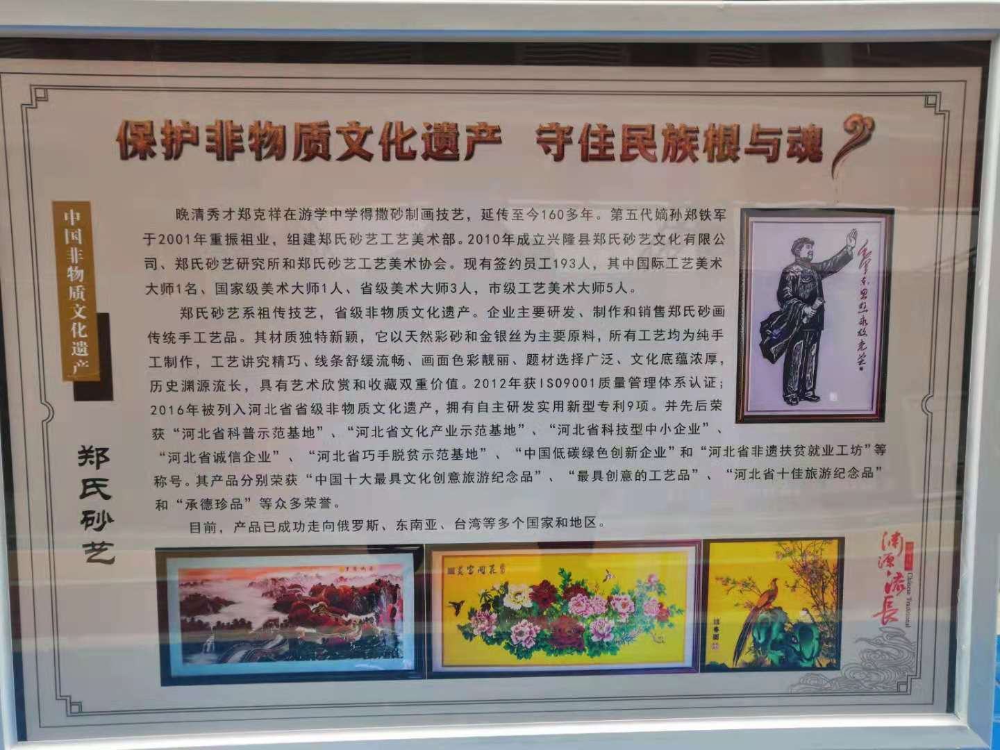 2021年5月15日,鄭氏砂藝應(yīng)邀參加三河市文化廣電和旅游局 “2021 年中國(guó)旅游日京津冀文旅資源推介暨 ‘京東文旅圈’成立”系列活動(dòng),活動(dòng)旨在有效推動(dòng)京津冀協(xié)同發(fā)展重大國(guó)家戰(zhàn)略,加快推進(jìn)興隆縣、遵化市、三河市等京東九縣(市、區(qū))一體化發(fā)展步伐,構(gòu)建文旅定位精準(zhǔn)清晰、資源高效利用、產(chǎn)業(yè)集群發(fā)展的區(qū)域發(fā)展新格局,共同打造京津冀文旅協(xié)同發(fā)展區(qū)。興隆縣旅游和文化廣電局局長(zhǎng)莊云飛帶領(lǐng)我縣特色文旅企業(yè)參加了此次活動(dòng),其中鄭氏砂藝代表我縣非遺文化產(chǎn)業(yè)出席活動(dòng),展出特色砂畫作品51幅,展出效果良好,得到了參觀人員一致好評(píng)。