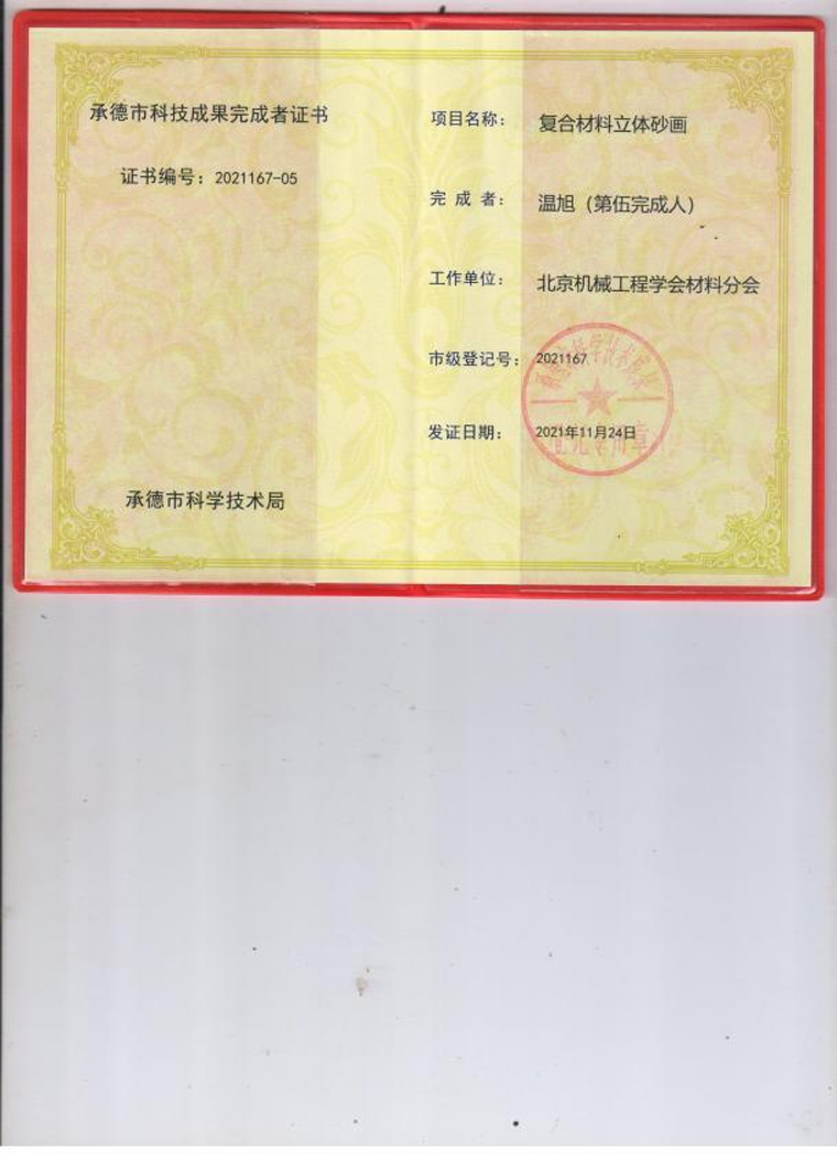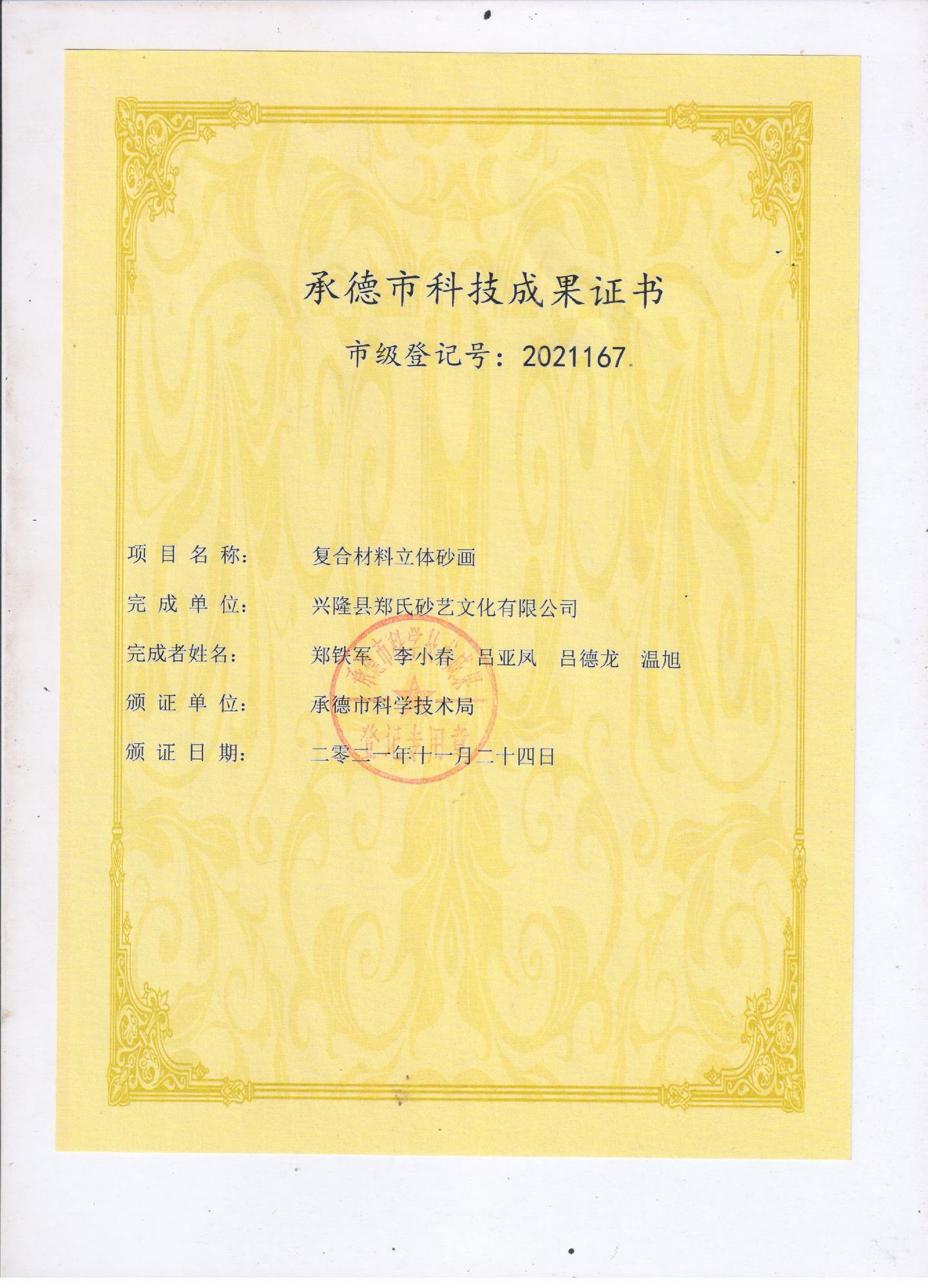 2021年11月24日,鄭氏砂藝圓滿(mǎn)完成了復(fù)合材料立體砂畫(huà)項(xiàng)目,獲得由承德市科技局頒發(fā)的《承德市科技成果證書(shū)》(市級(jí)登記號(hào):2021167),該項(xiàng)目課題來(lái)源于承德市科學(xué)技術(shù)研究與發(fā)展計(jì)劃,由我公司和北京機(jī)械工程學(xué)會(huì)材料分會(huì)共同完成。項(xiàng)目以天然彩砂和金屬絲為主要材料,畫(huà)面中加入其它復(fù)合材料(如山楂核、樹(shù)葉等),制成立體砂畫(huà),砂畫(huà)畫(huà)面采用透明樹(shù)脂壓膜技術(shù),保持彩砂畫(huà)面與膜不脫落,不褪色。通過(guò)該項(xiàng)目的研究,企業(yè)創(chuàng)新產(chǎn)品5個(gè)系列200多種作品,其中包括:砂畫(huà)木質(zhì)筆筒系列、水晶砂畫(huà)系列、砂畫(huà)手機(jī)殼系列、磁盤(pán)砂畫(huà)系列、活性炭砂畫(huà)系列,極大的提升企業(yè)產(chǎn)品質(zhì)量。