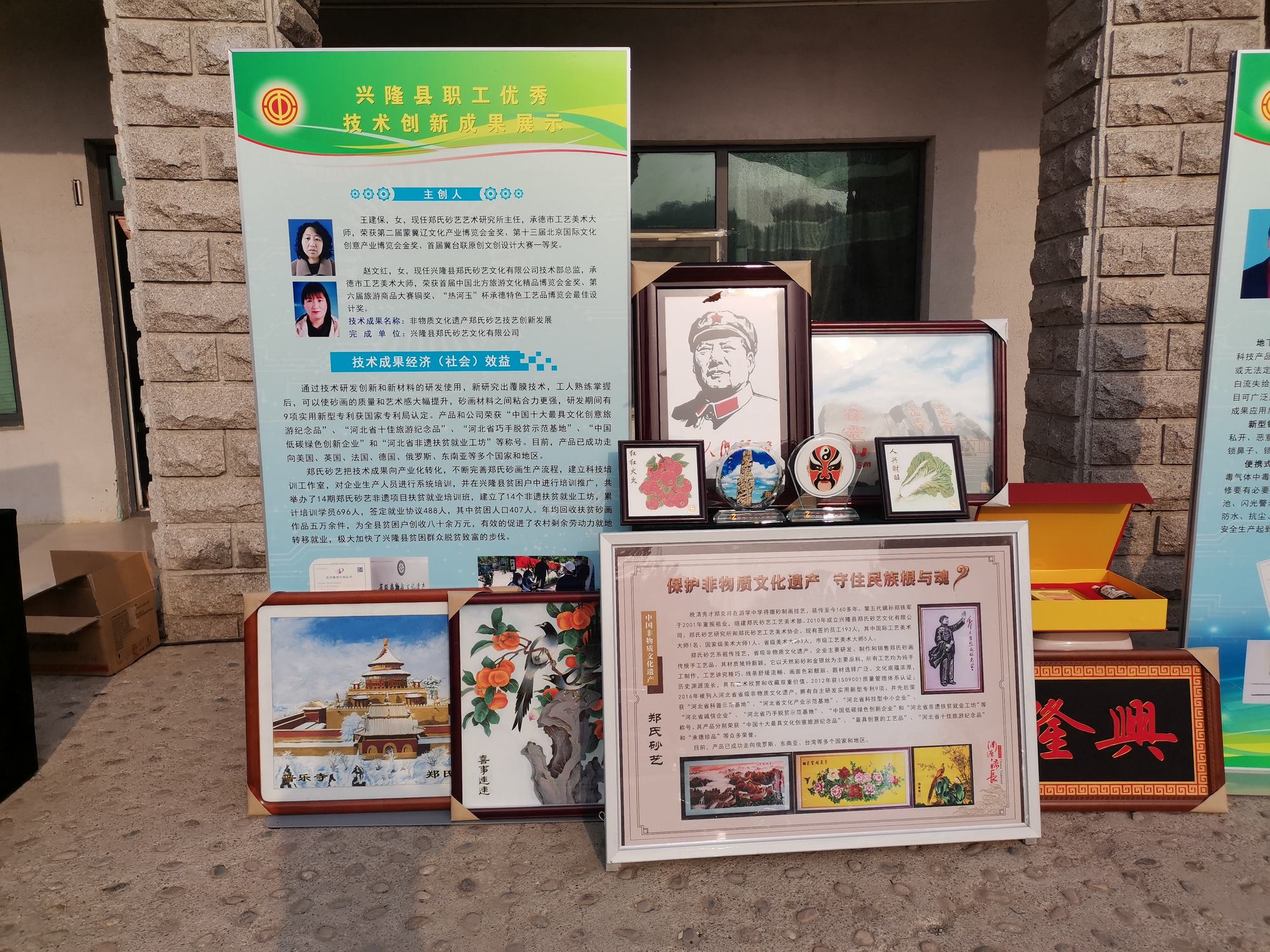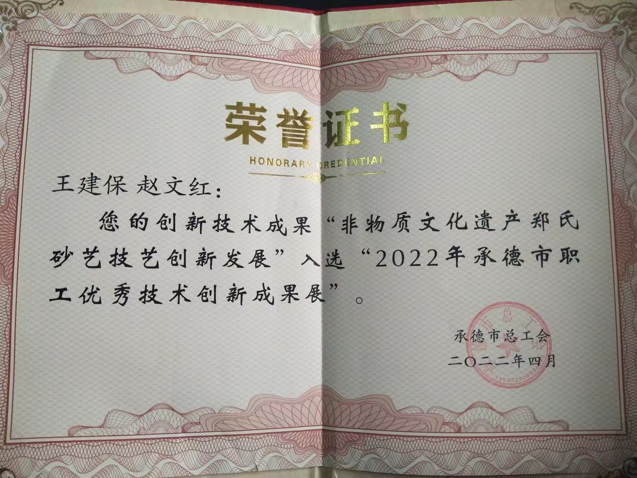 2022年4月26日上午,由承德市總工會組織的“2022年承德市職工優(yōu)秀技術(shù)創(chuàng)新成果展”在承德市勞動公園盛大舉行,出席此次活動的主要市領(lǐng)導(dǎo)有承德市市委書記柴寶良、市長王亞軍、市委副書記郭旭濤、市人大常委會黨組書記、主任劉文勤、市政協(xié)黨組書記、主席吳清海、市總工會主席關(guān)繼高、市總工會黨組書記常務(wù)副主席侯國天、市總工會二級調(diào)研員司志通等市總領(lǐng)導(dǎo)。興隆縣出席此次活動的主要領(lǐng)導(dǎo)有縣委副書記孫常君、縣人大常委會黨組副書記、總工會黨組書記、主席王立群、縣總工會常務(wù)主席司志允、縣總工會副主席姜存衛(wèi)和部室負責(zé)人管宏艷,活動主要展示近年來全市職工群眾性技術(shù)創(chuàng)新活動取得的優(yōu)秀技術(shù)創(chuàng)新成果。經(jīng)市總初選鄭氏砂藝參加了此次活動,執(zhí)行董事鄭鐵軍攜職工王建保、趙文紅的創(chuàng)新成果“非物質(zhì)文化遺產(chǎn)鄭氏砂藝技藝創(chuàng)新發(fā)展”入選展示,鄭氏砂藝展示的覆膜砂畫、御用頸枕、水晶砂畫等系列創(chuàng)新作品受到市縣各級領(lǐng)導(dǎo)的一致青睞和好評。