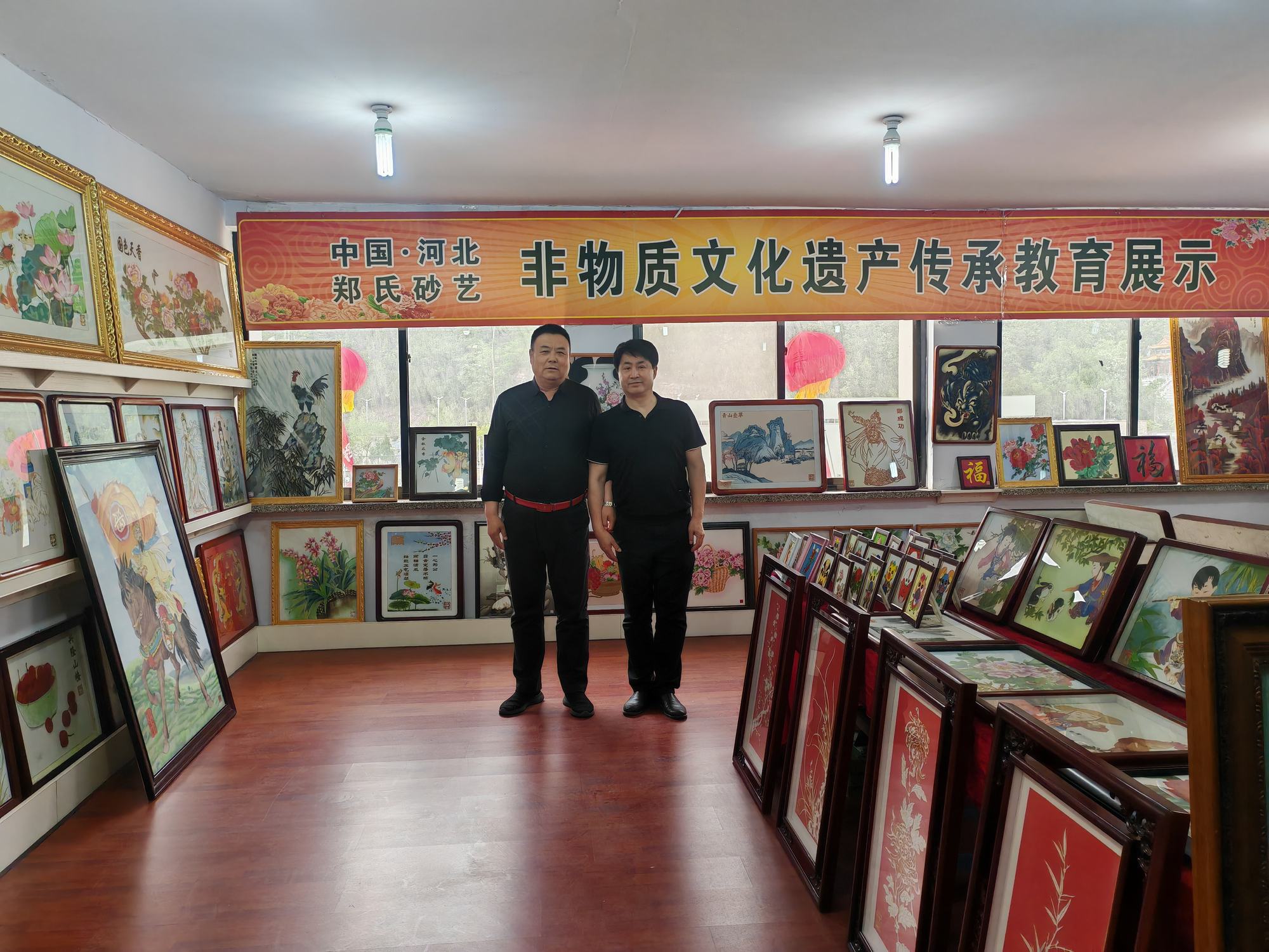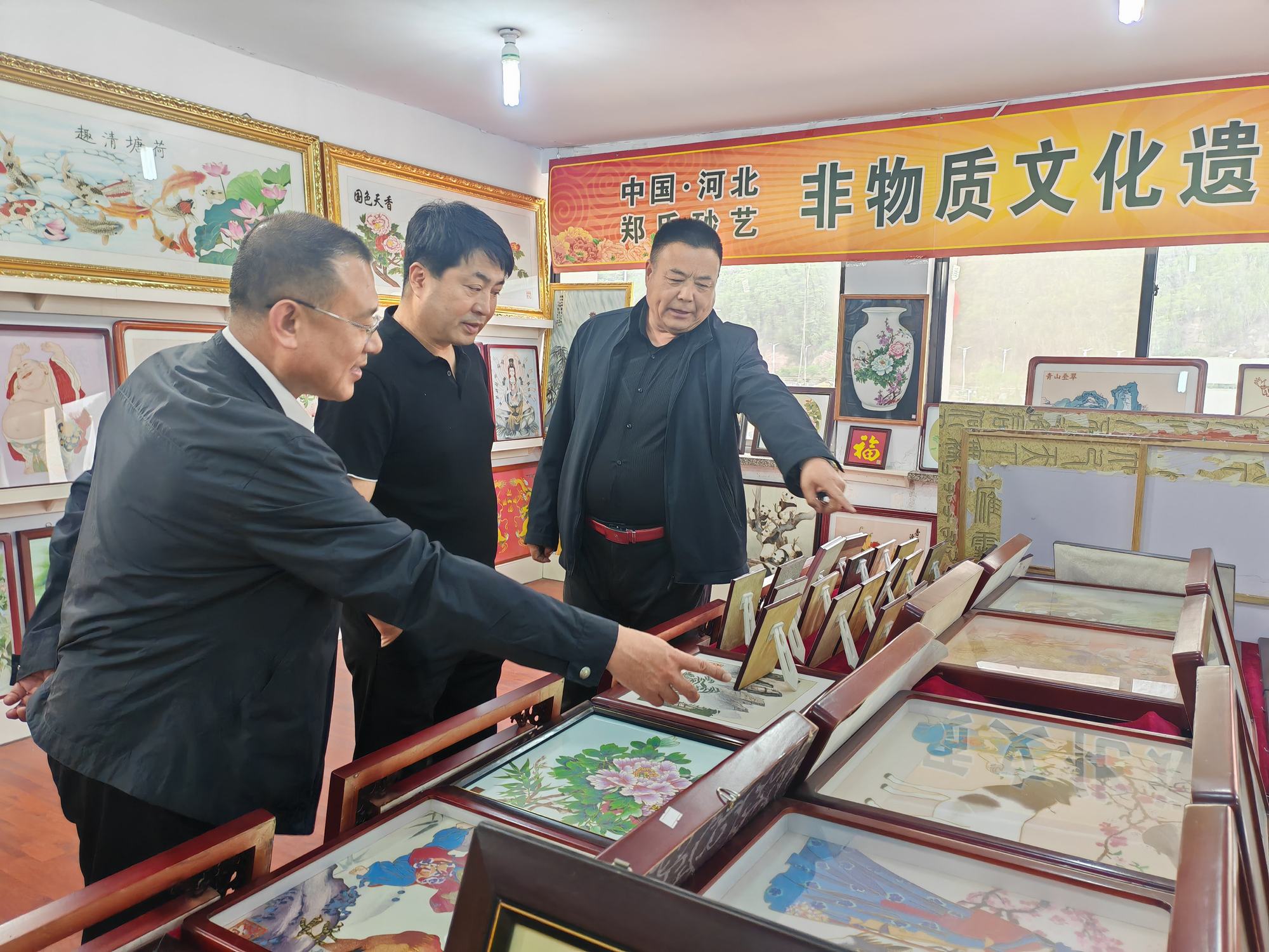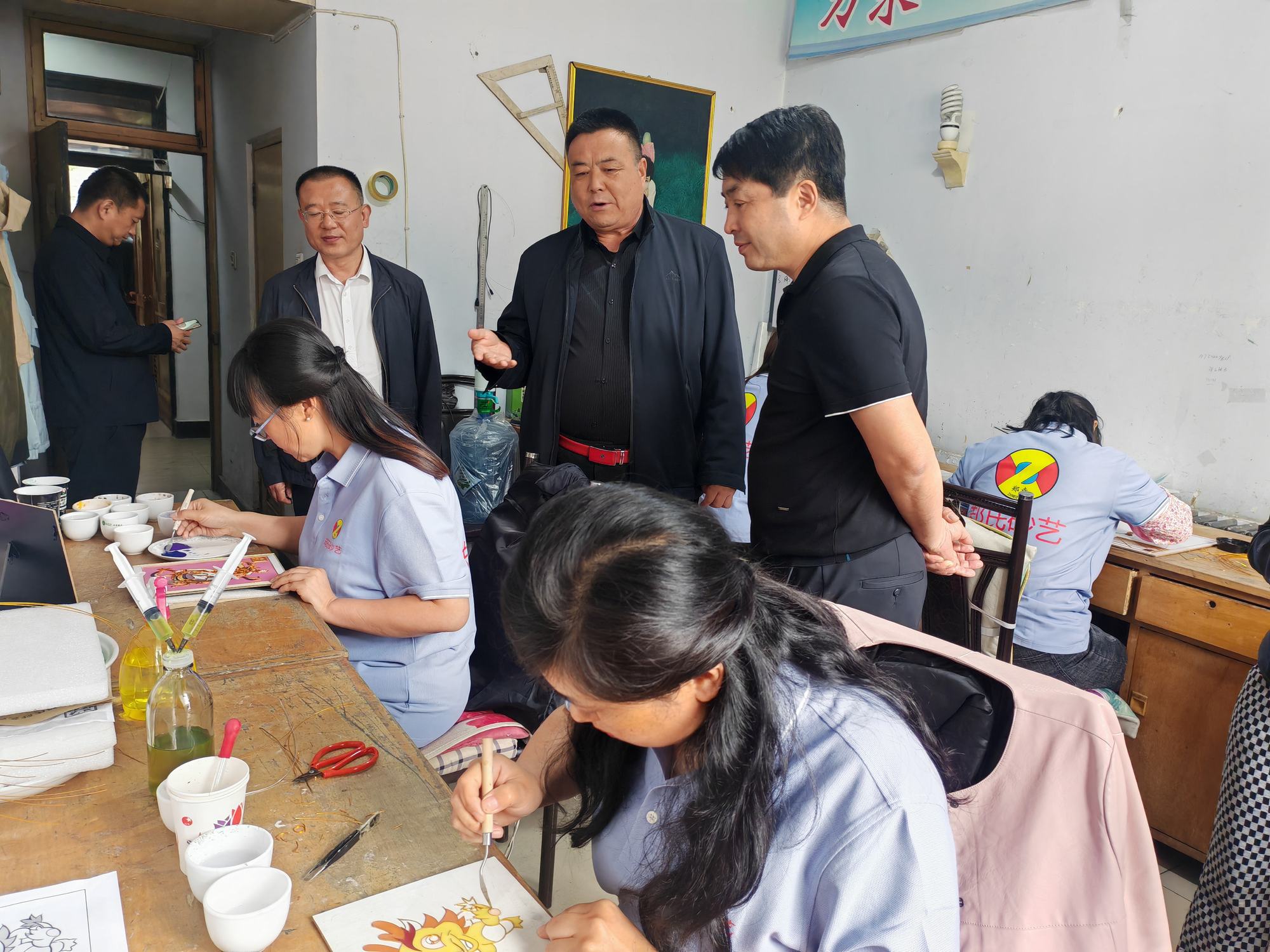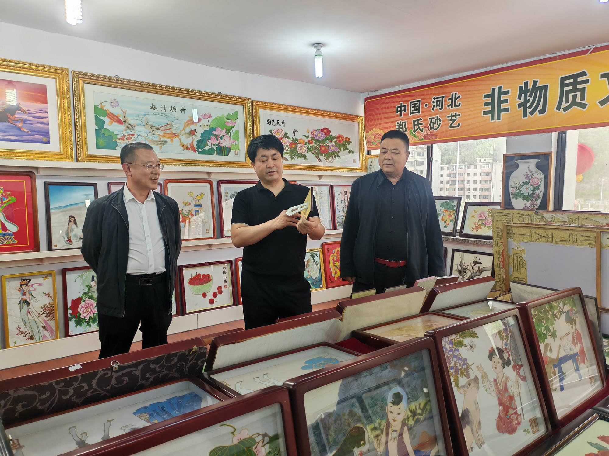 程志忠書記等一行在鄭氏砂藝董事長鄭鐵軍的陪同下,參觀了鄭氏砂藝非遺文化展館,了解了鄭氏砂藝非遺文化的傳承和發(fā)展。隨后,實(shí)地觀察了鄭氏砂藝(畫)的制作過程,并與砂藝技師們進(jìn)行了交流,了解了砂畫制作原料和技藝手法。