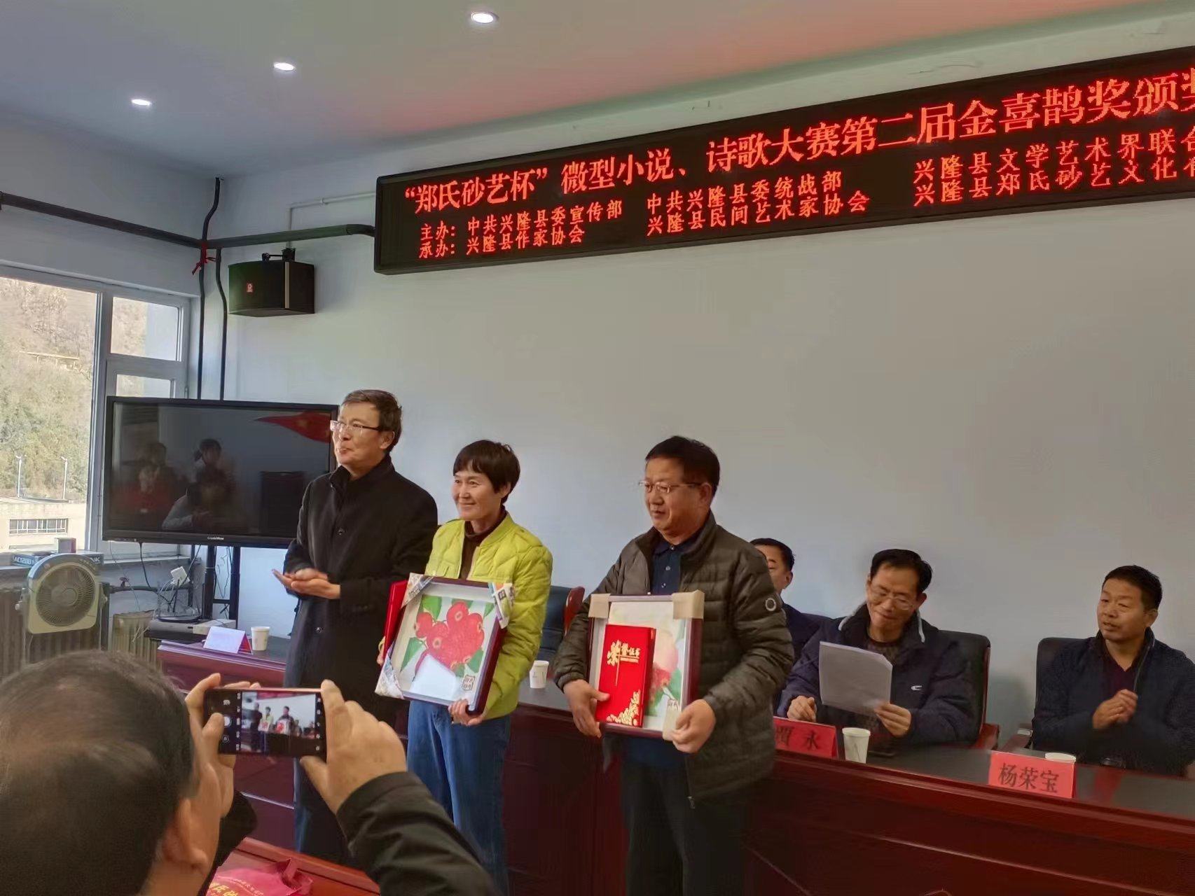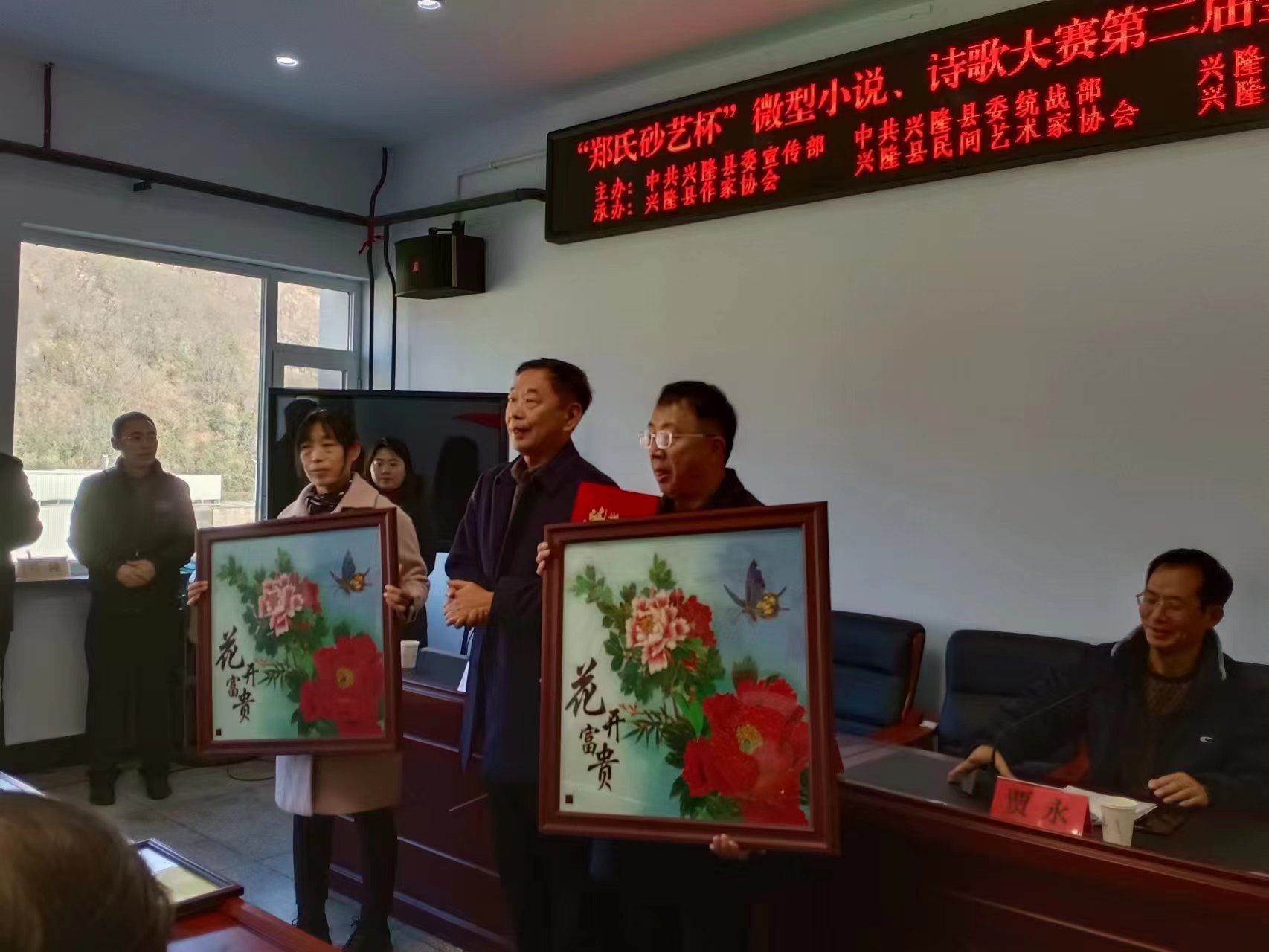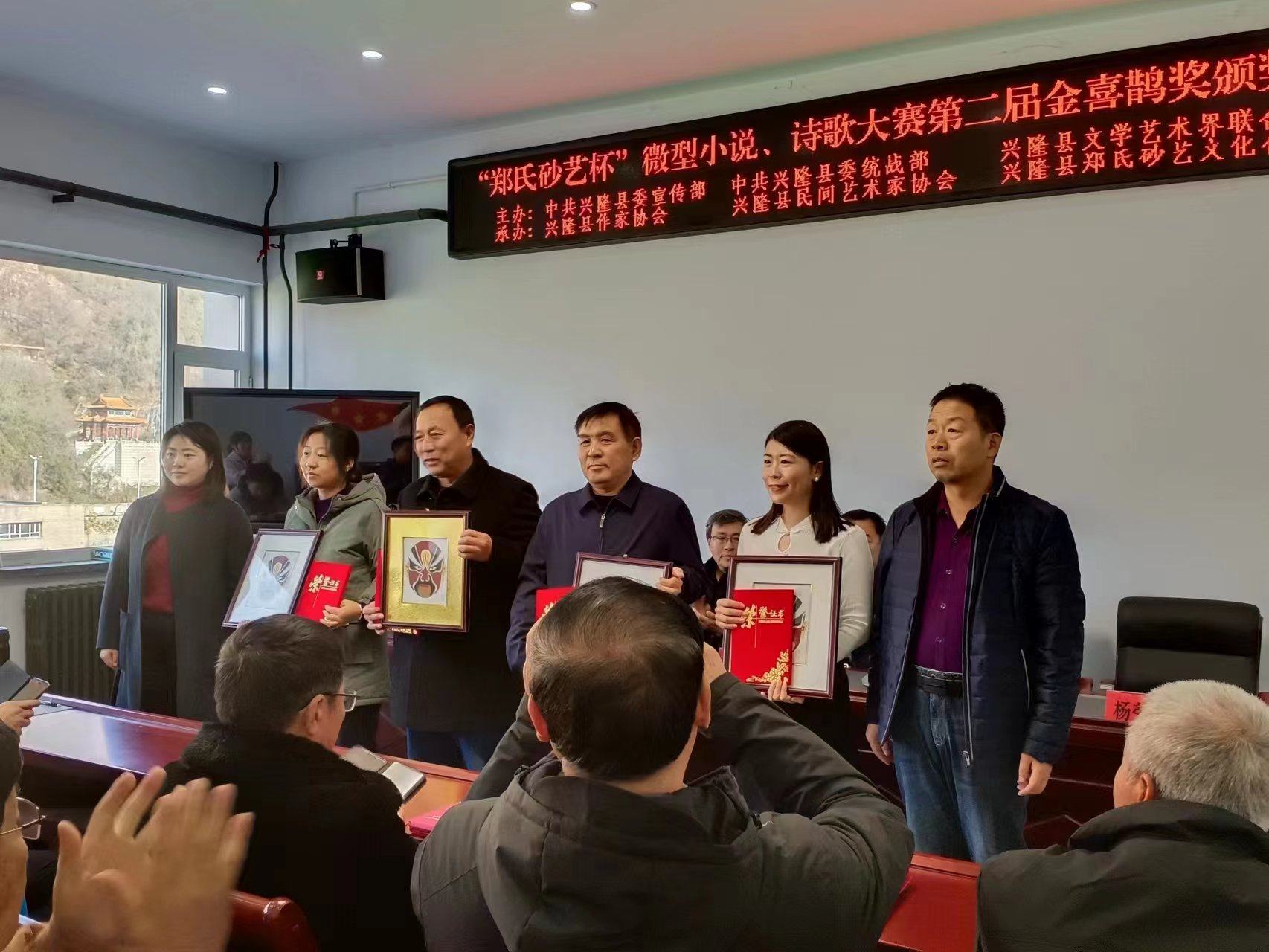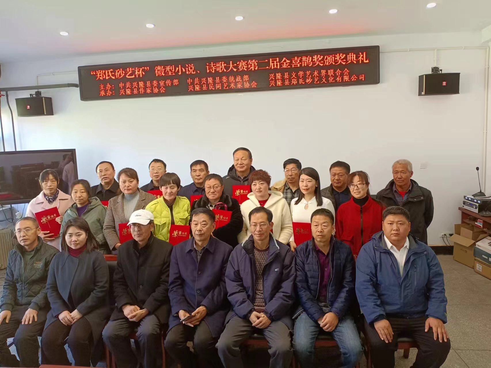 2023年11月9日上午,在興隆縣鄭氏砂藝文化有限公司舉辦了由中共興隆縣委宣傳部、中共興隆縣委統(tǒng)戰(zhàn)部、興隆縣文學(xué)藝術(shù)界聯(lián)合會主辦,興隆縣作協(xié)、興隆縣民間藝術(shù)家協(xié)會和興隆縣鄭氏砂藝文化有限公司承辦的“鄭氏砂藝杯”微型小說、詩歌大賽第二屆金喜鵲獎頒獎典禮,出席此次頒獎典禮的主要領(lǐng)導(dǎo)有承德市作家協(xié)會主席王琦,承德市文聯(lián)二級調(diào)研員閆春生,興隆縣委宣傳部副部長、文明辦主任溫偉,興隆縣委統(tǒng)戰(zhàn)部常務(wù)副部長楊榮寶,興隆縣作協(xié)主席王金石,興隆縣鄭氏砂藝文化有限公司董事長、縣民協(xié)主席鄭鐵軍及“鄭氏砂藝杯”微型小說、詩歌大賽獲獎人員,典禮由興隆縣文學(xué)藝術(shù)界聯(lián)合會主席賈永主持。