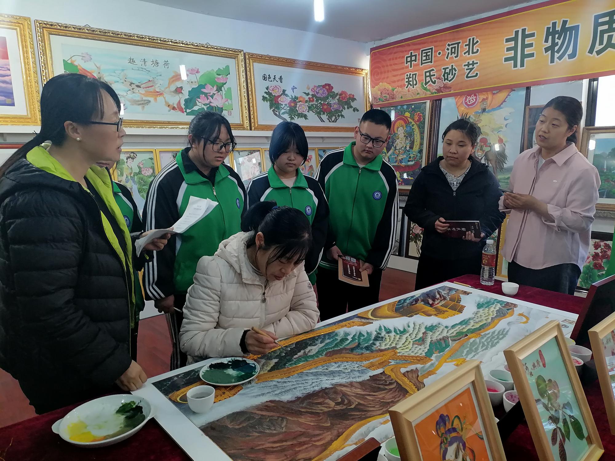 為了更好地向師生們展示砂藝技藝,鄭氏砂藝精心準(zhǔn)備了砂藝制作展演,多位砂藝技師分步展演砂藝制作過(guò)程,并由河北省勞動(dòng)模范、非遺傳承技師王鳳艷詳述掐絲勾線、礦物彩砂分層填充等核心工藝要領(lǐng)。學(xué)生通過(guò)全程觀摩砂畫制作工藝流程,切實(shí)領(lǐng)悟"毫厘之間見(jiàn)真章"的工匠精神內(nèi)涵。當(dāng)流光溢彩的礦物砂粒與金銀絲線在技師手中逐漸形成美麗的畫面時(shí),展廳內(nèi)頻現(xiàn)此起彼伏的驚嘆聲。師生們對(duì)砂藝作品呈現(xiàn)的現(xiàn)實(shí)感染力深感震撼,坦言線上了解遠(yuǎn)不及實(shí)地體驗(yàn)深刻。帶隊(duì)教師劉贏總結(jié)表示:"鄭氏砂藝在非遺傳承中的堅(jiān)守與創(chuàng)新值得學(xué)習(xí),鼓勵(lì)大家傳承技師們精益求精的工匠精神,腳踏實(shí)地踐行人生目標(biāo)。"