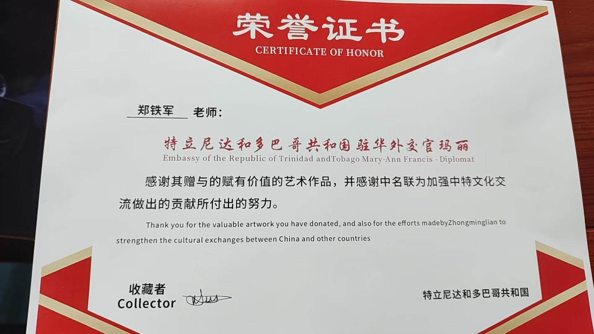 近日,應(yīng)特立尼達(dá)和多巴哥共和國(guó)駐華大使館的誠(chéng)摯邀請(qǐng),鄭氏砂藝(畫)形象代言人劉秀華女士攜中名聯(lián)簽約國(guó)禮藝術(shù)家鄭鐵軍老師的砂藝作品,踏入使館殿堂,為兩國(guó)文化交流增添了新的色彩。