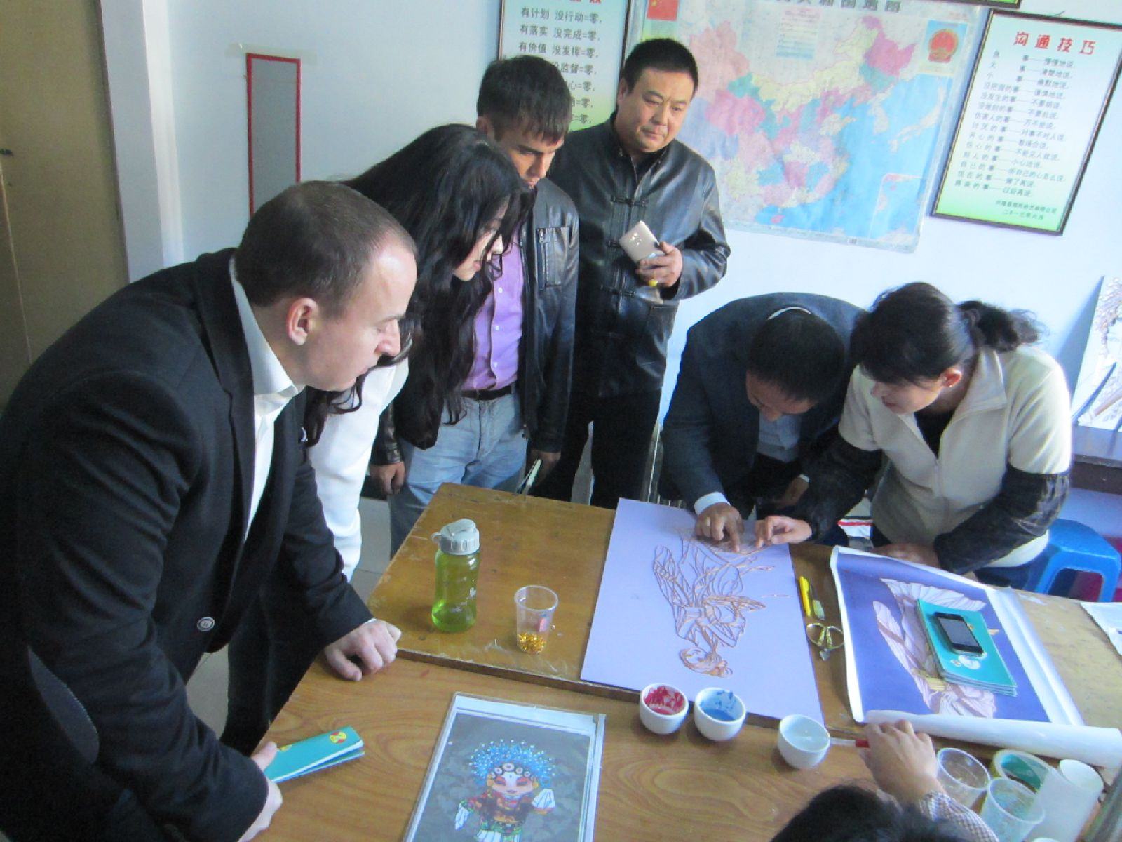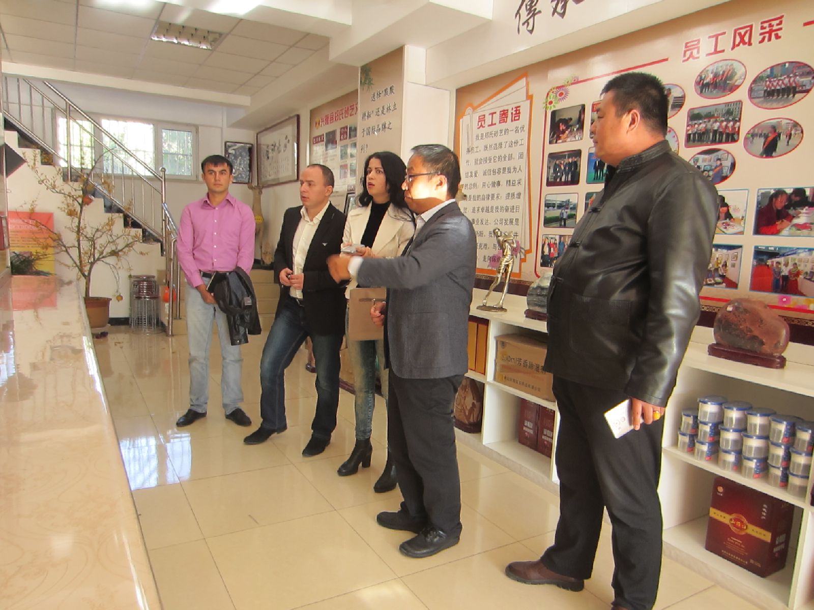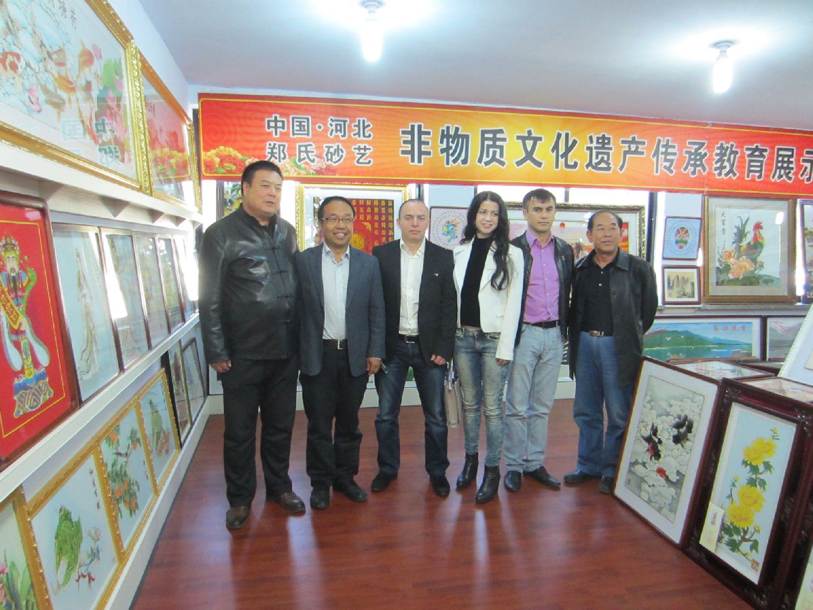 2016年10月17日下午,天津中新天生態(tài)城濱海外國語大學(xué)董事夢祺兼任英語翻譯率領(lǐng)俄羅斯客商勞拉女士(AURA)、鮑家先生(BURTIA)和阿列克謝先生(ALEXANDRIA)來到興隆縣鄭氏砂藝公司,對鄭氏金銀絲砂畫制作車間、傳統(tǒng)工藝、展廳進(jìn)行了商務(wù)性考察。鄭氏金銀絲砂畫的傳統(tǒng)工藝、精美的做工和豐富多彩的主題畫面,引起了客商們的極大興趣和關(guān)注。雙方還就產(chǎn)品交易對接等工作達(dá)成了初步意向。