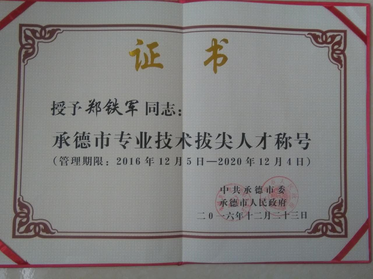 董事長鄭鐵軍榮獲《承德市專業(yè)技術(shù)拔尖人才》榮譽(yù)稱號