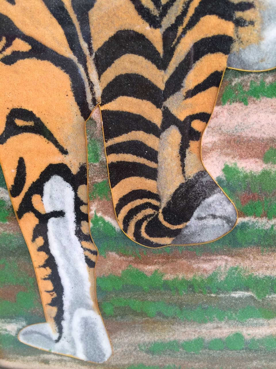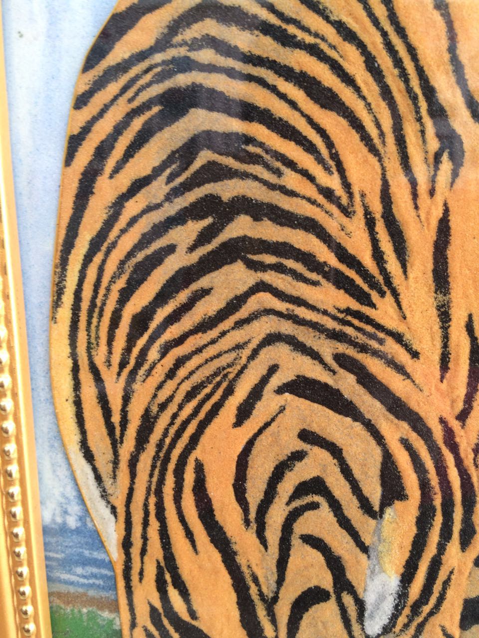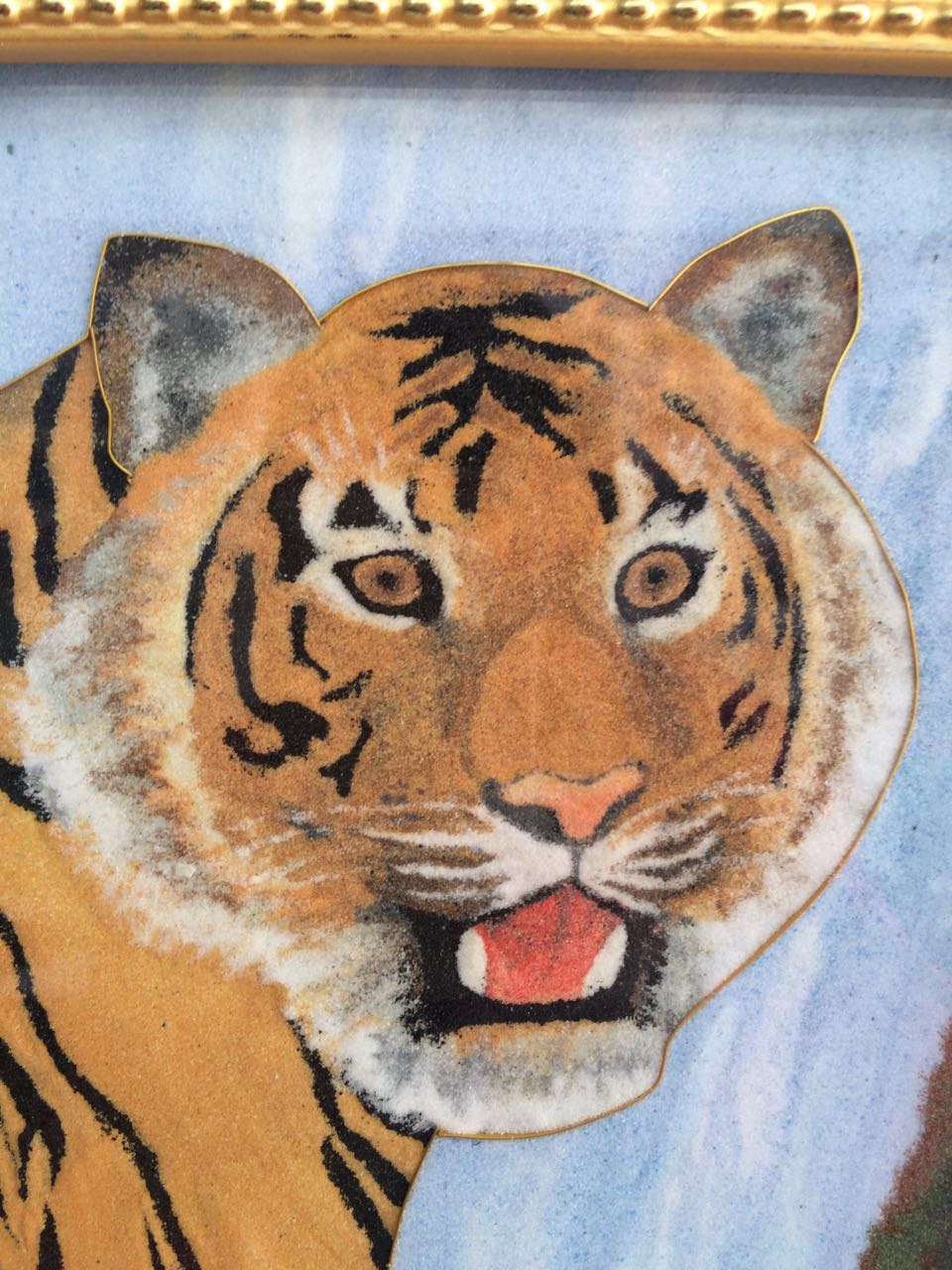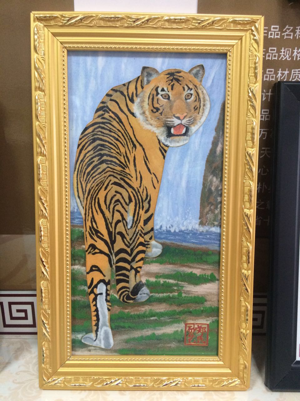 《老虎》28*58*3.5cm(長(zhǎng)*寬*高),該產(chǎn)品以老虎作為畫的主題, 老虎屬大型貓科動(dòng)物;毛色淺黃或棕黃色,滿有黑色橫紋;頭圓、耳短,耳背面黑色,中央有一白斑甚顯著;四肢健壯有力;尾粗長(zhǎng),具黑色環(huán)紋,尾端黑色。鄭氏金絲彩砂畫采用金銀絲與彩砂結(jié)合,填制出一只威猛的老虎。